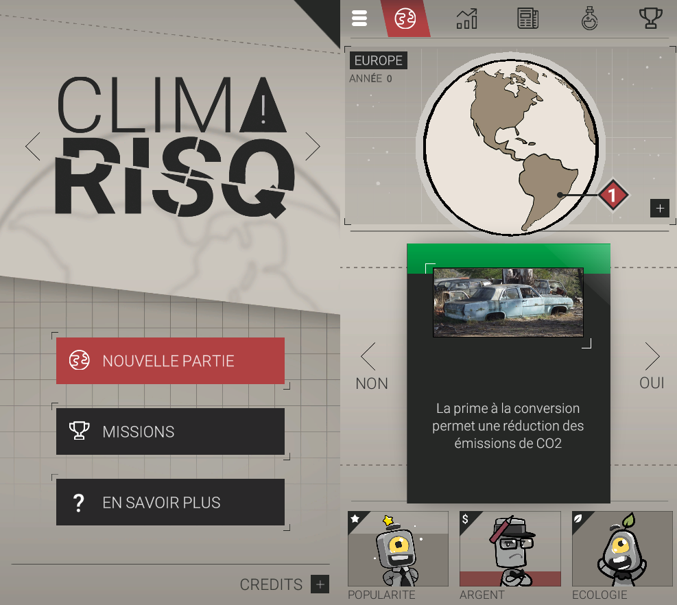 Ce projet de médiation met en place une appli-jeu où les joueurs sont amenés à prendre des décisions au niveau local ou global pour limiter la fréquence et les impacts écologiques et socio-économiques des événements extrêmes.